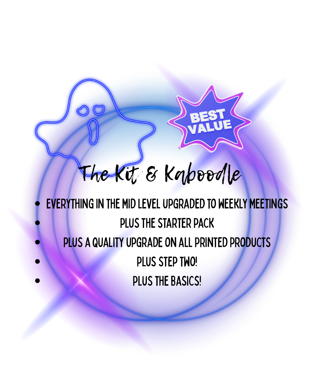 Everything that is included in “The Basics, Step Two, & Mid Level” PLUS upgrade to weekly meetings, adding in physical promotional products; t-shirt or crew neck, business card or sticker design, and one promotional item.